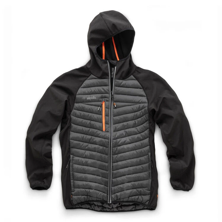 Scruffs Trade Thermo Jacket Black is a lightweight padded softshell jacket made from hard wearing nylon fabric. Insatherm padding insulates the core and retains body heat. Flexible softshell sleeves and side panels. Elasticated hood, hem and cuffs keep wind out and warmth in. 3 x external zipped pockets. 96% polyester, 4% elastane.